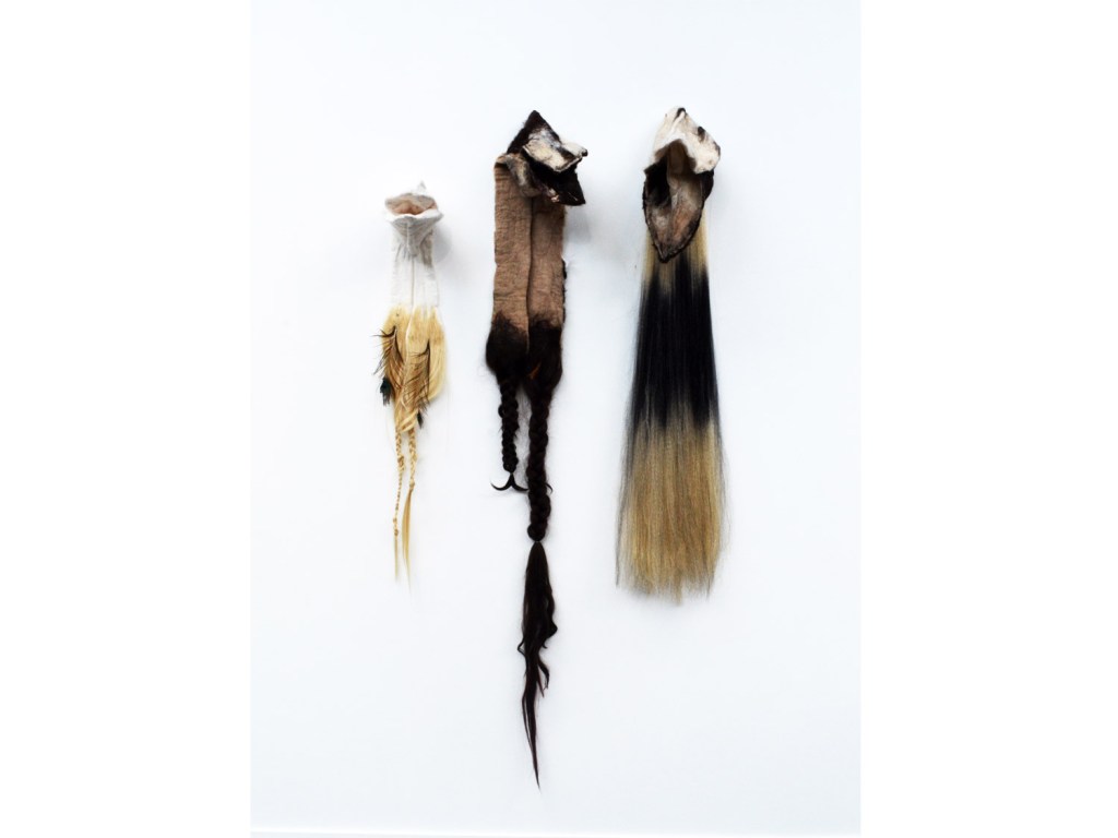 Elodie Wysocki explore ainsi les vies de Judith, de Marie Madeleine, de Lady Godiva, des Parques, de la Loba, des Harpies et d’autres femmes puissantes issues d’une mythologie qui forme les fondations d’un imaginaire commun. L’artiste pense et réalise les œuvres à partir d’une mythologie ancestrale et actuelle dont les figures sont réelles, surréelles, connues et méconnues. A partir aussi de son expérience personnelle et intime qui trouve nécessaire des échos collectifs. Ainsi, les œuvres proviennent de deux matériaux principaux : les cheveux et la terre. Des matières-archives aux propriétés extrêmement différentes, avec lesquelles l’artiste élabore un ensemble de techniques comme le feutrage et la céramique. Par là, elle allie l’humaine à la terre et vice versa. Les matériaux manifestent une interdépendance, un récit commun. En 2018, Elodie Wysocki réalise Harpie, un manteau qu’elle qualifie de “militaire” entièrement formé de feutres de cheveux et de poils humains. De la femme-oiseau il ne reste, comme une relique, que le vêtement suspendu dans l’espace. Plus récemment, l’artiste présente Des échos, des autres (2023) : quatre corps fantomatiques drapés de toges et de capuches. Ces figures que l’artiste nomme des “carcasses” sont faites de de terre et d’oxyde de fer. Elles sont posées sur un amas de terre et de bribes d’autres corps – des œuvres antérieures que l’artiste a choisi de briser. Les quatre corps forment un cercle de pouvoir, ils résistent au temps et à l’espace. Tels les corps des sorcières mises au bûcher, ils se tiennent debout malgré les violences et la mort.