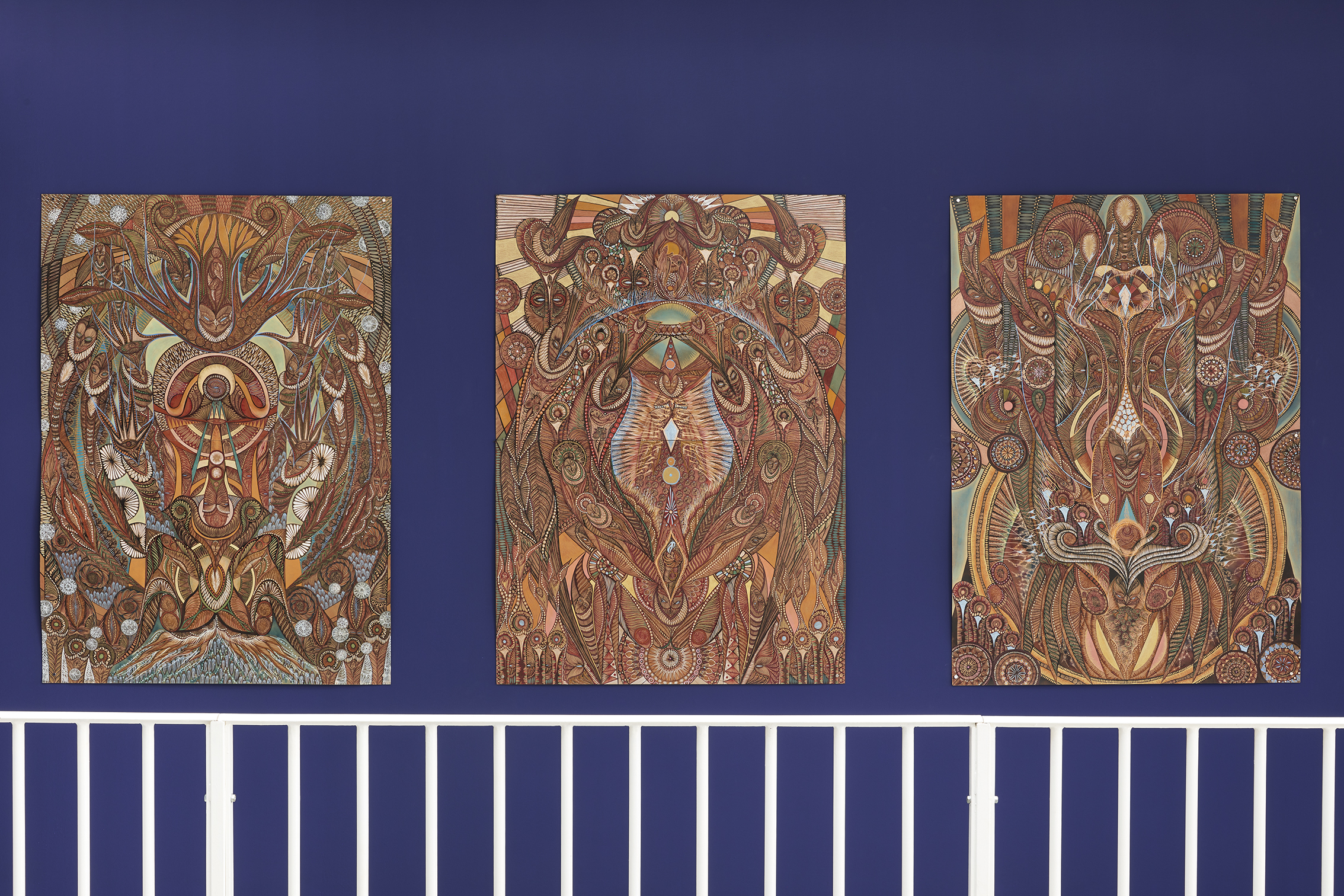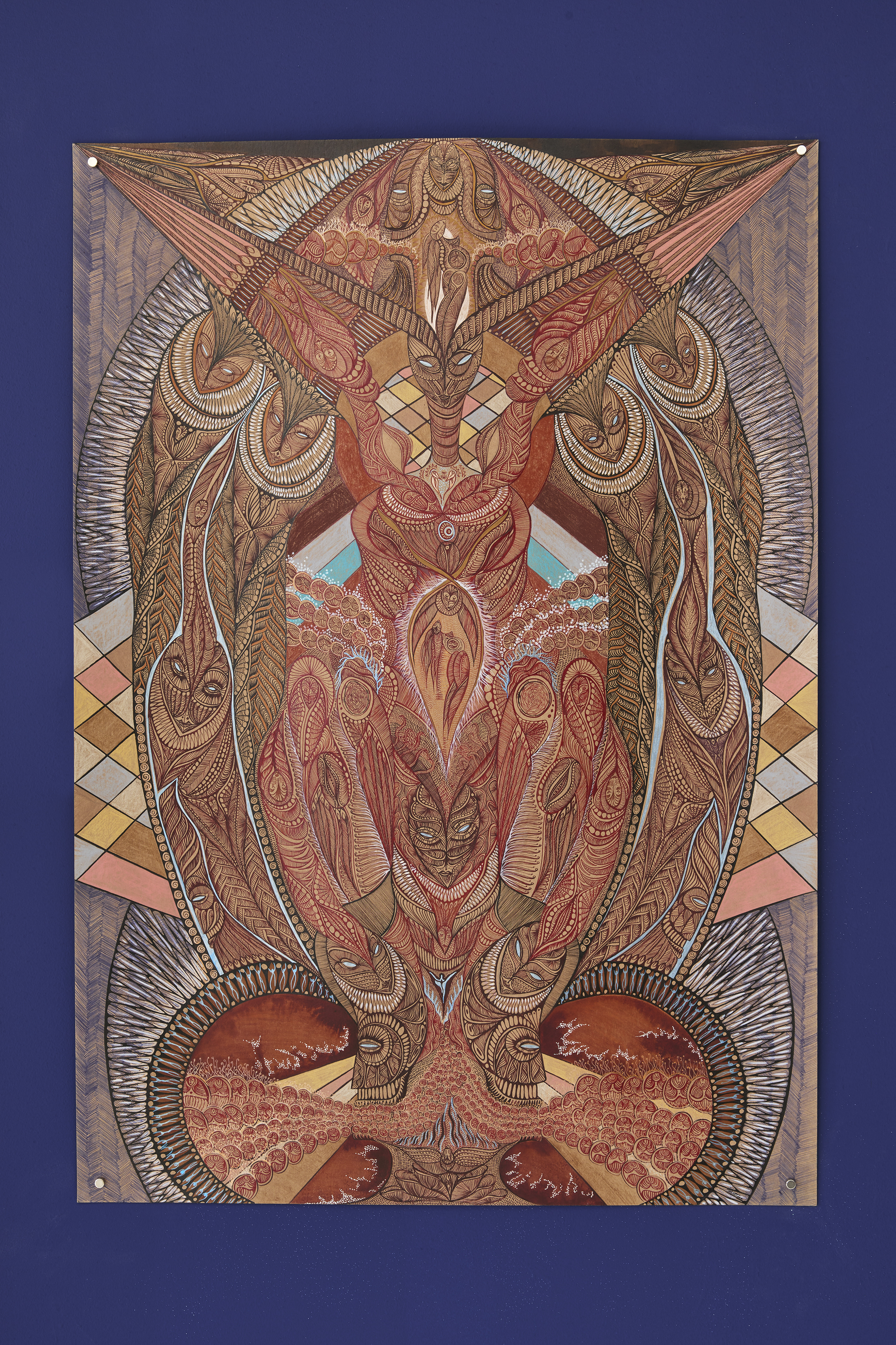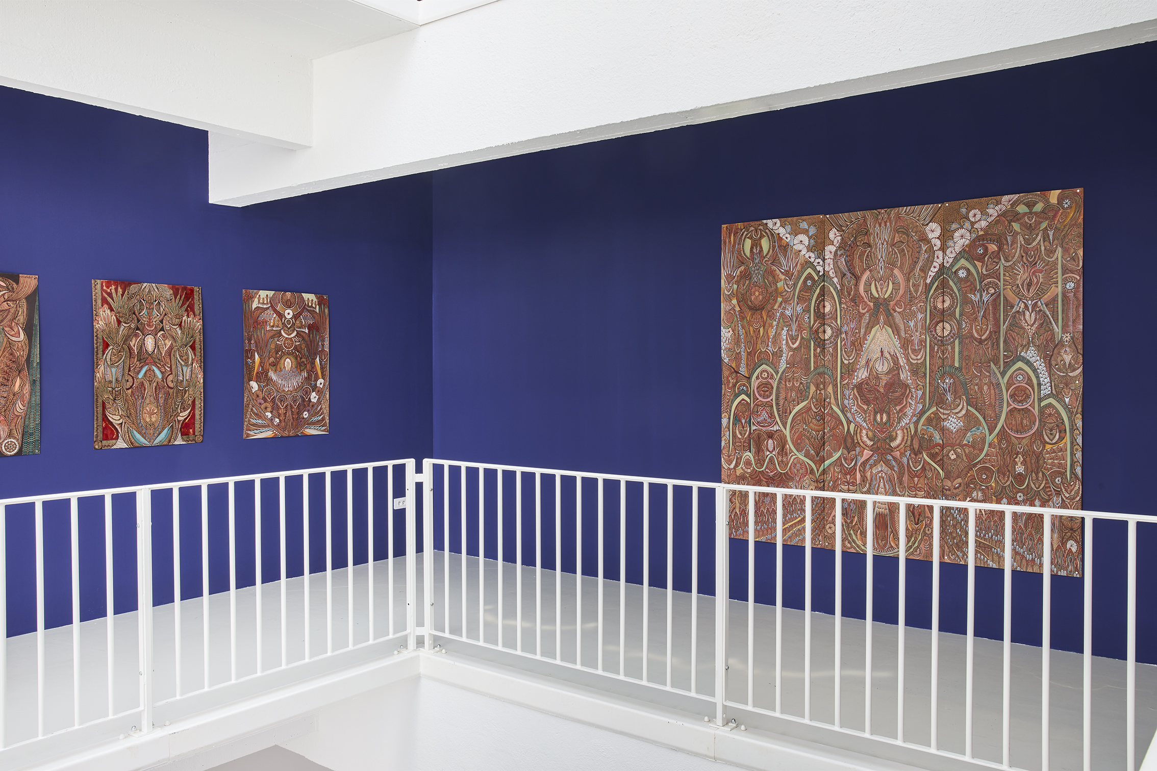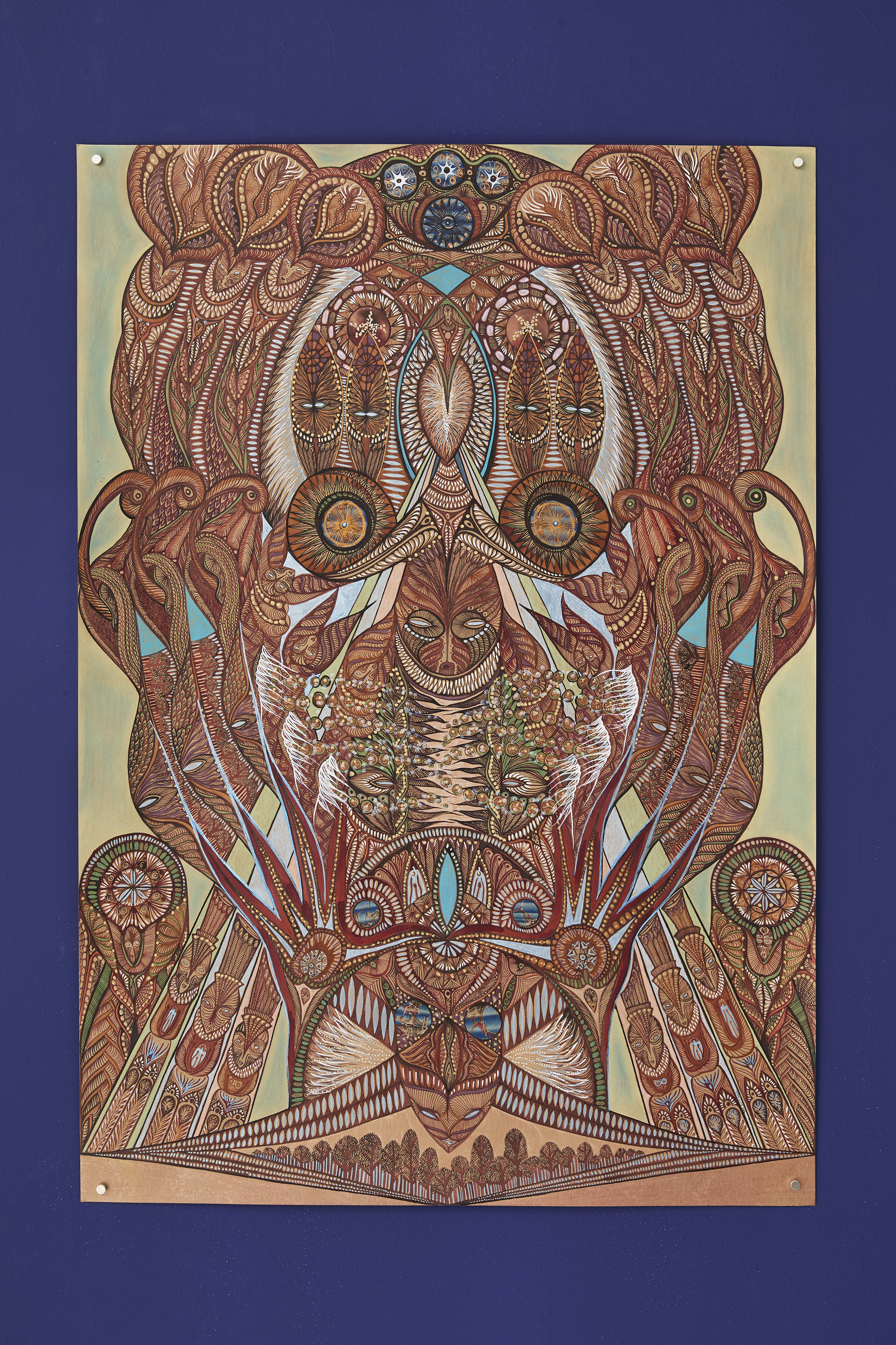 Margot écrit en 2023 : « Je suis à cheval entre deux mondes. Le mien et le vôtre. C’est une question d’équilibre. Ce que m’apporte ma création n’a pas vraiment d’importance, je le fais car je dois le faire. Je dois vous apporter ça. Ce que vous voyez à travers ma création (mes yeux, ma main, mon esprit), c’est la magie ancestrale que nous avons oubliée à force d’explications. Cette magie parle aux cœurs et non à la raison. Elle EST. Elle existe et existera bien après ma mort. » Les dessins de Margot sont à envisager comme des portes que l’artiste ouvre vers des espaces mentaux aussi structurés que libres. Face aux œuvres nous nous retrouvons au seuil de territoires interdépendants : l’obscurité et la lumière, le chaos et l’ordre (la symétrie en est l’outil), le réel et le surréel, le terrestre et l’extraterrestre, l’humain et la chimère, l’utopie et la dystopie. Margot fusionne et architecture les paradoxes pour générer un univers nourri d’une pensée du commun et de l’interdépendance. Les titres de ses œuvres sont d’ailleurs issus de l’espéranto ou bien d’une langue intime qu’elle fabrique au fil des œuvres. Par la ligne, la couleur, la lumière et le mot, Margot relie les existences pour donner forme à un tout profond et puissant.
