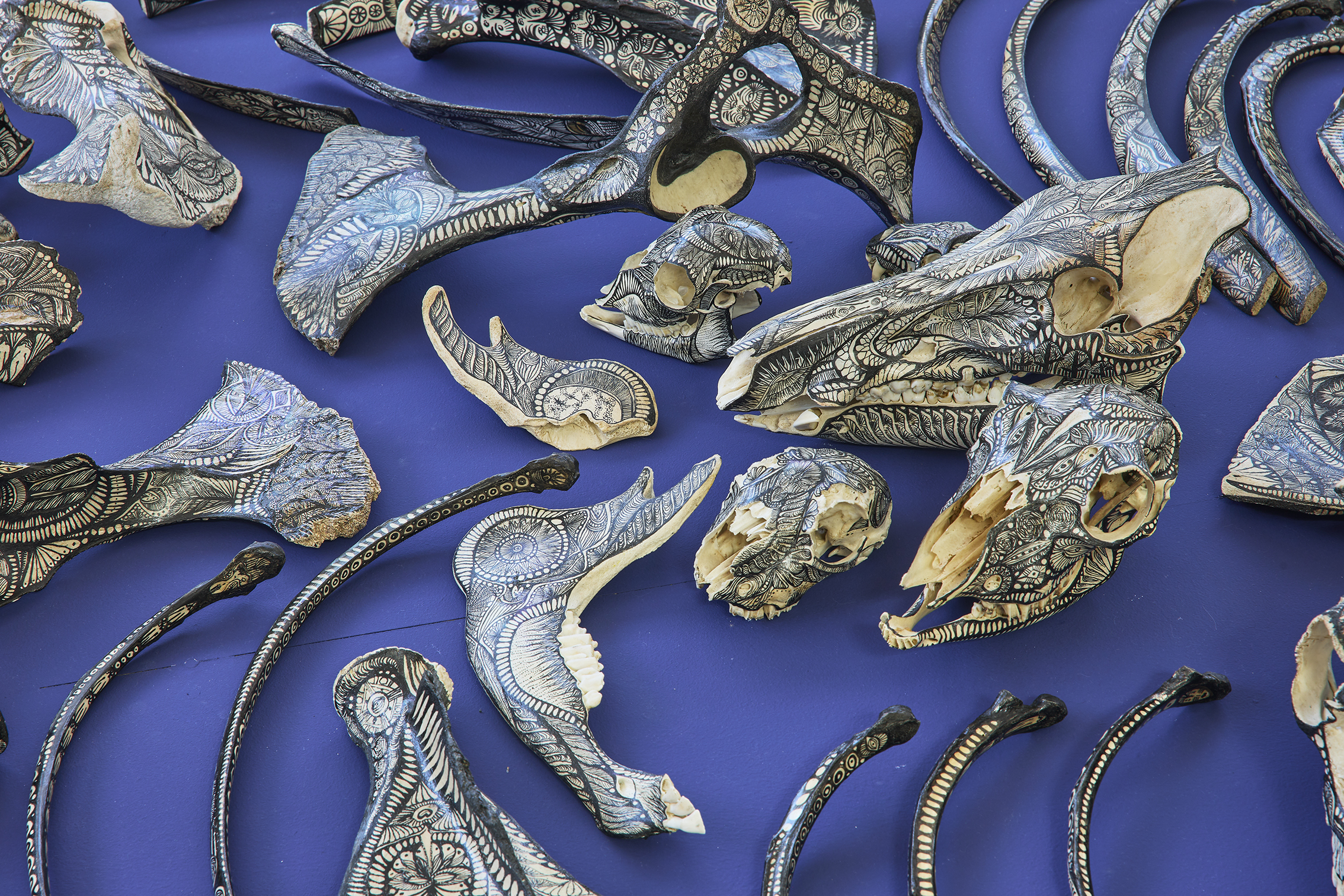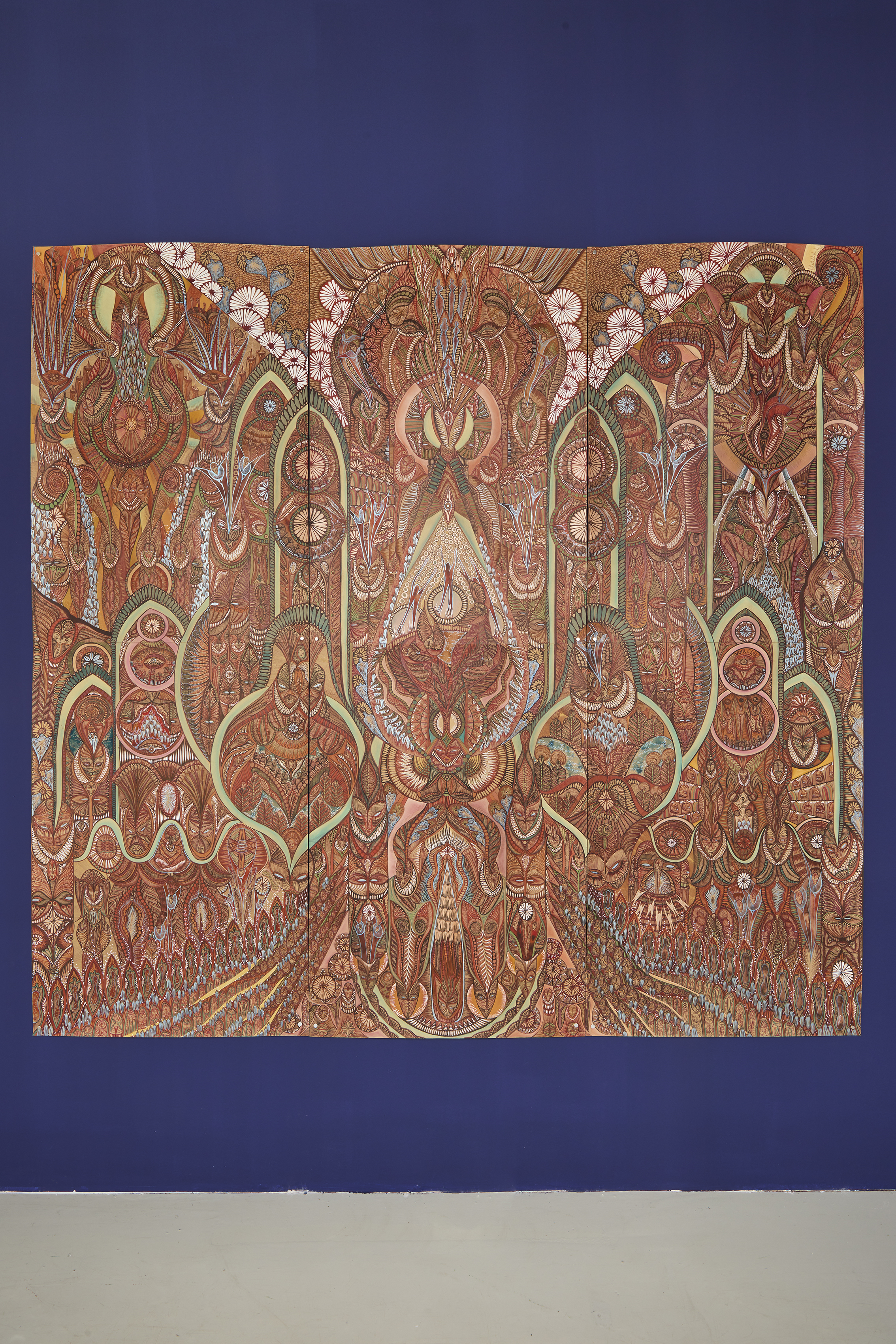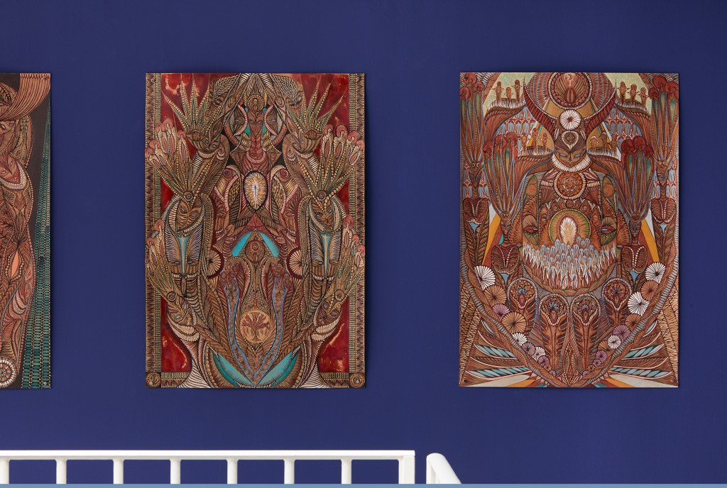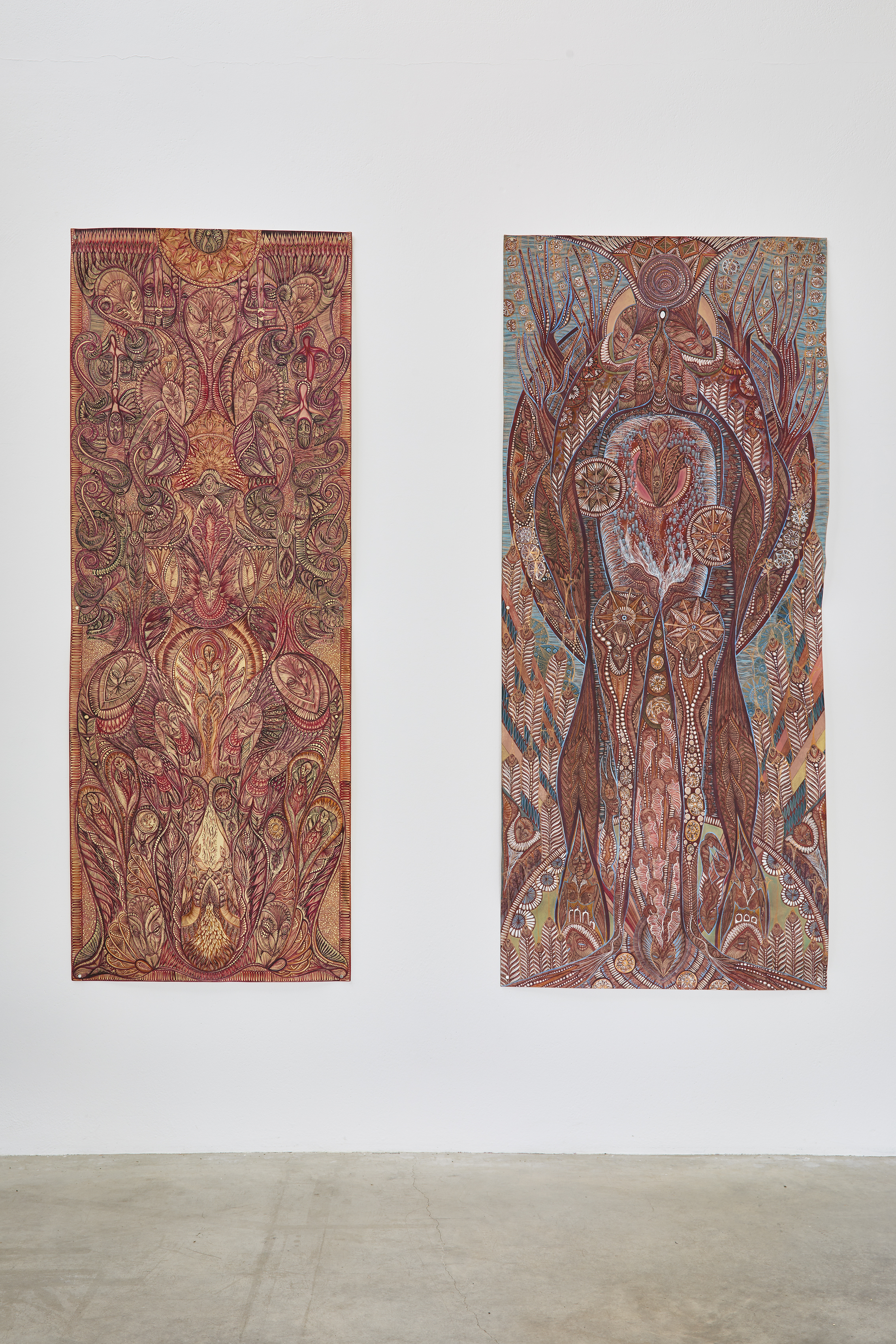 Margot écrit en 2023 : « Je suis à cheval entre deux mondes. Le mien et le vôtre. C’est une question d’équilibre. Ce que m’apporte ma création n’a pas vraiment d’importance, je le fais car je dois le faire. Je dois vous apporter ça. Ce que vous voyez à travers ma création (mes yeux, ma main, mon esprit), c’est la magie ancestrale que nous avons oubliée à force d’explications. Cette magie parle aux cœurs et non à la raison. Elle EST. Elle existe et existera bien après ma mort. » Les dessins de Margot sont à envisager comme des portes que l’artiste ouvre vers des espaces mentaux aussi structurés que libres. Face aux œuvres nous nous retrouvons au seuil de territoires interdépendants : l’obscurité et la lumière, le chaos et l’ordre (la symétrie en est l’outil), le réel et le surréel, le terrestre et l’extraterrestre, l’humain et la chimère, l’utopie et la dystopie. Margot fusionne et architecture les paradoxes pour générer un univers nourri d’une pensée du commun et de l’interdépendance. Les titres de ses œuvres sont d’ailleurs issus de l’espéranto ou bien d’une langue intime qu’elle fabrique au fil des œuvres. Par la ligne, la couleur, la lumière et le mot, Margot relie les existences pour donner forme à un tout profond et puissant.