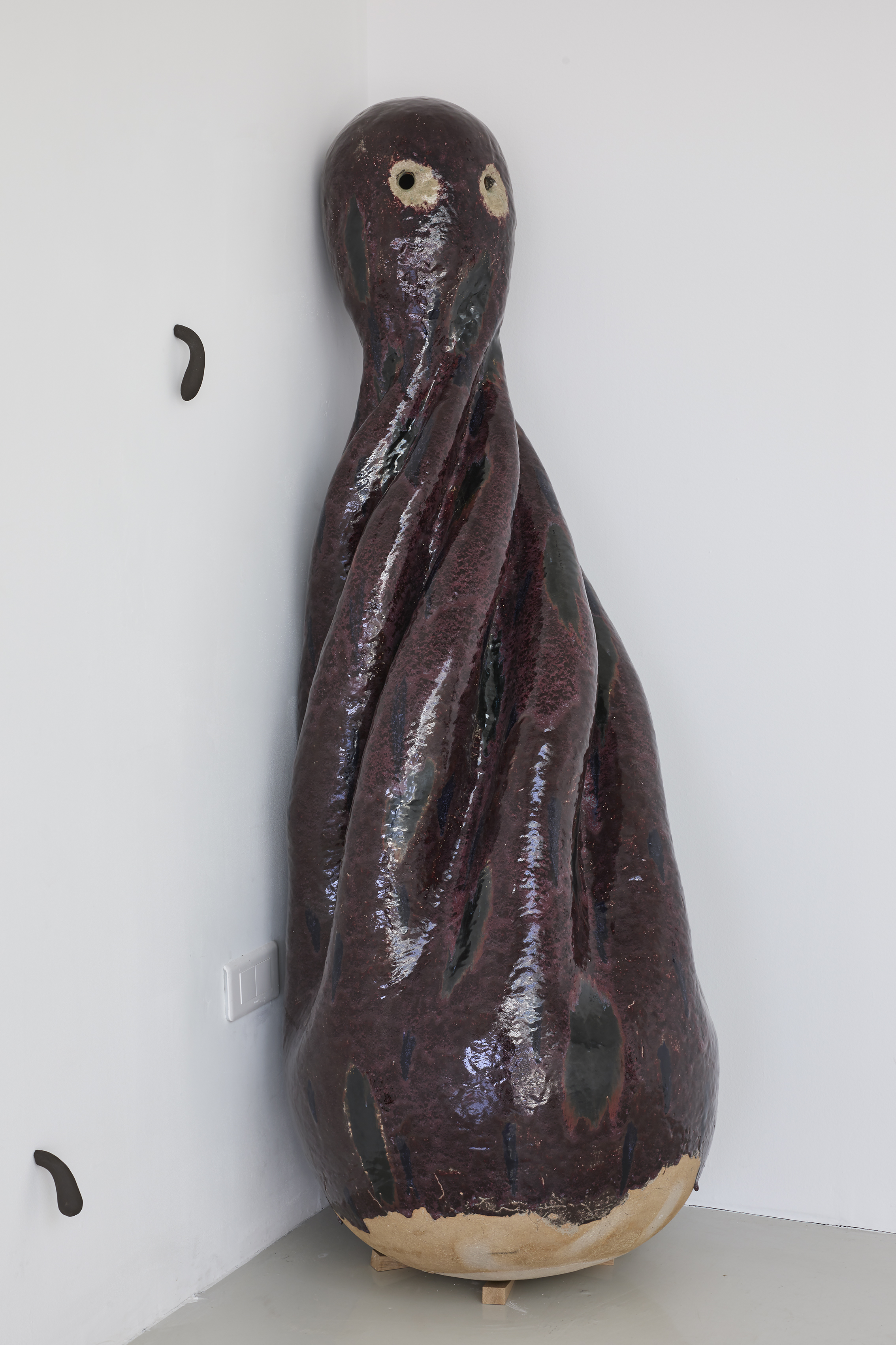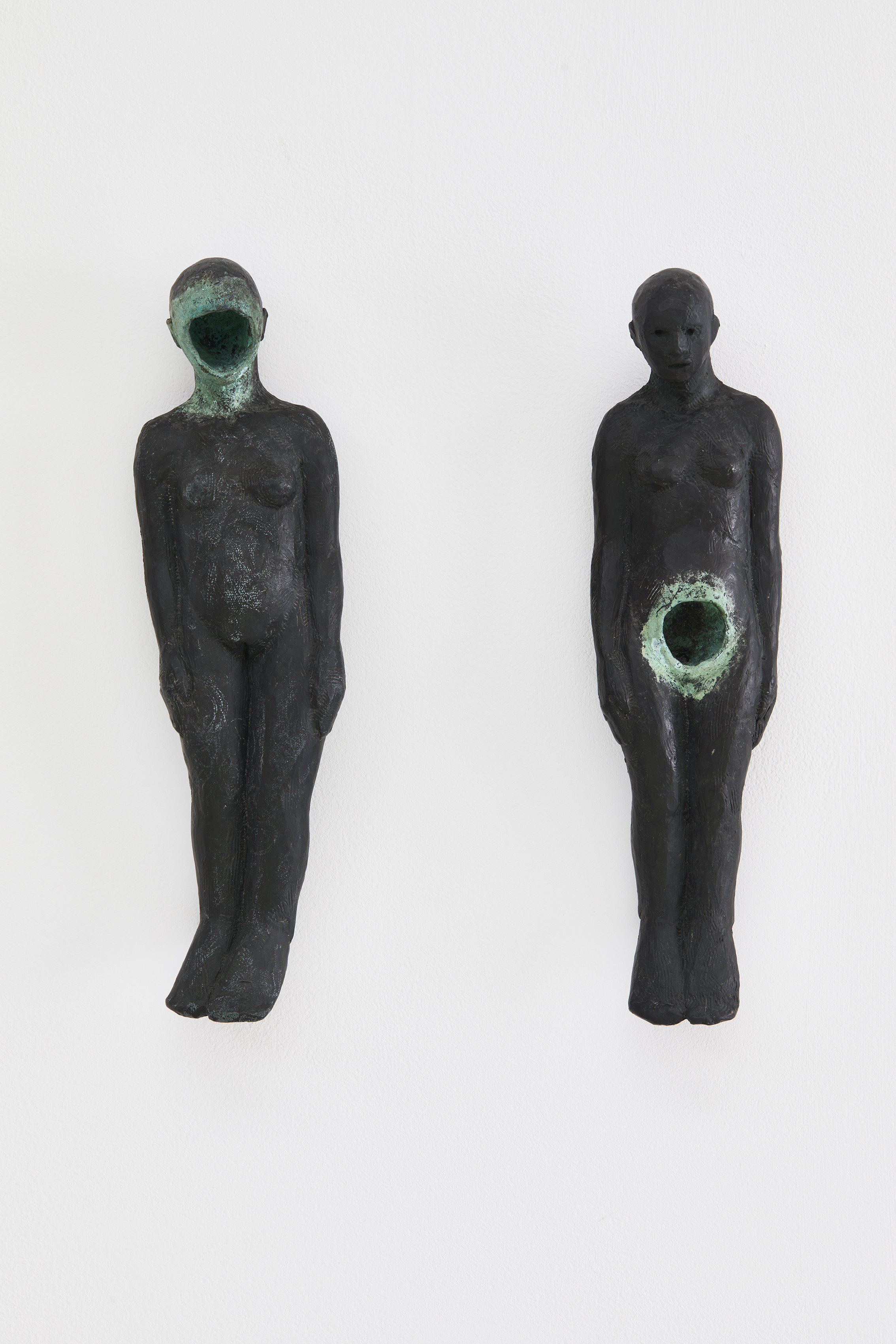Les mains dans la terre, Anne Rochette modèle les fragments de son corps, les formes de son expérience intime, les fragments de sa mémoire et les traces des violences reçues. L’artiste comprend le corps comme un abri complexe : il est le lieu des résistances, de l’affirmation, de la vie, mais il est aussi le contenant d’une mémoire traumatique, de violences enfouies, d’impensés et d’expériences invisibilisées. Il est une maison qui abrite ce que nous sommes totalement, de manière consciente et inconsciente. Nos corps sont les vaisseaux de ce qui nous est étrange(r), de ce que nous refoulons, de nos secrets, de nos peurs les plus profondes et de nos désirs souvent ignorés. Ainsi, les sculptures agissent dans une zone inconfortable, elles génèrent un trouble parce qu’elles rendent présents l’informe, l’intérieur, l’hybridation. Elles portent une dimension quasi monstrueuse – le monstre est le corps que l’on montre parce qu’il ne correspond pas aux normes imposées par la pensée dominante. Anne Rochette modèle des corps sur la réserve, des fragments (la peau d’un muscle, une tête, un pied, une main), des suintements des orifices béants ou clos. Les corps ou les parties de corps semblent piégés au sein de formes-enveloppes et pris dans un profond silence. Des corps comme des masses humaines qui se ramassent, ou bien se cachent partiellement pour ne pas s’exposer pleinement. Ils se protègent des regards extérieurs. Dans ce double mouvement, Anne Rochette pose dans l’espace des corps à la fois repliés et manifestement présents. Des corps pudiques et résistants.