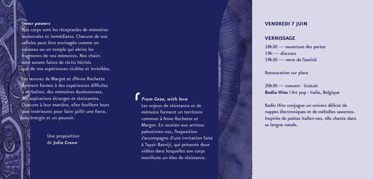 Parce que les enjeux de résistance et de mémoire forment un territoire commun à Anne Rochette et Margot, nous avons souhaité inviter Taysir Batniji (né en 1966 à Gaza, vit et travaille à Paris) à prendre part à l’exposition Inner Powers. From Gaza, with Love est une invitation à l’artiste palestinien à présenter un programme d’œuvres vidéo pour occuper le terrain des consciences. Les vidéos manifestent une résistance par le corps pour lutter contre l’ultra-violence et contre l’effacement d’une mémoire aussi intime que collective. Sa présence artistique au centre d’art est une présence poétique et politique pour dénoncer le génocide en cours à Gaza et la colonisation de la Palestine par l’État israelien. Parce que le silence est assourdissant, From Gaza, with Love est une manière, symbolique et modeste, de manifester notre soutien au peuple palestinien. Que cesse enfin le feu d’une manière permanente.