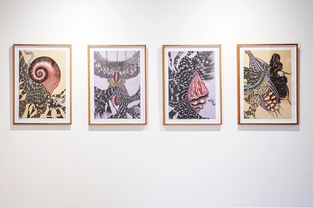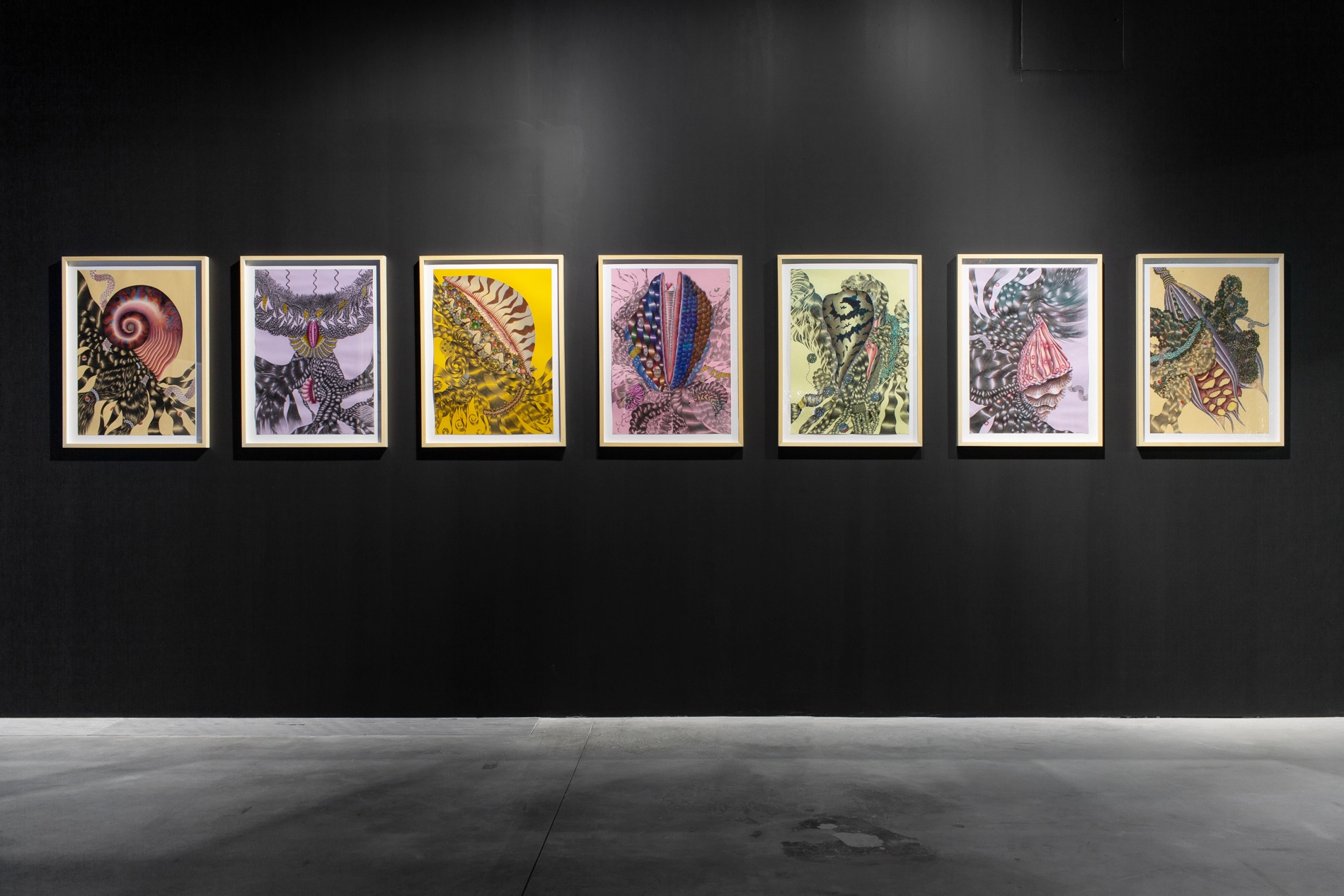 À partir de 1995, Catherine Boyer réalise d’autres séries d’oeuvres en céramique, comme Reclining Littoral, dont les formes modelées s’apparentent à des sexes féminins, des coraux, des graines, des cavités souterraines, des peaux reptiliennes ou des mouvements des vagues. La surface de la terre est travaillée avec précision. L’incrustation délicatement répétée des motifs organiques rappelle d’autres techniques comme la dentelle ou la pâtisserie. “Mon réel est fait de gestes patiemment recommencés. Mes gestes limitent en même temps qu’ils illimitent.” L’artiste relie les imaginaires, les formes s’y prolongent et s’hybrident avec douceur, finesse et rigueur. En 2009, elle poursuit sa quête contaminatrice et proliférante avec une série de dessins intitulée Luminescence. Sur des feuilles de papiers teintés, elle dessine des tresses de cheveux baignées de lumière. Animée “par un amour de l’eau, de l’énergie de l’océan, des brillances et des diamants sur l’eau”, elle s’applique à restituer au crayon des effets de scintillement, de reflets, d’ombres et d’éclats. La longue chevelure frisée représente selon elle un puissant symbole de féminité dont elle prend soin. Sur terre ou sous la mer, la tresse s’apparente aux antennes d’un insecte filiforme, à une liane, à une racine, à une tige, à une algue ou encore à un tentacule. La tresse de cheveux relie les corps, humains et non humains, elle est le rhizome d’une coexistence sensible et consciente. Par elle, Catherine Boyer déploie une esthétique où son propre corps n’est jamais pensé d’une manière séparée de son écosystème – autrement dit du lieu qu’il l’habite. Elle est à l’écoute de son corps et du milieu par lequel il est affecté au quotidien. Alors, le vivant de l’île trouve une place fondamentale au creux de sa réflexion et de sa démarche plastique. Du microscopique au cosmique, d’une cellule à une fleur d’orchidées, les corps et leurs échelles s’entrelacent et forment de nouveaux êtres. Un voyage mental qui se poursuit avec la série de dessins intitulée Divineariane (2020- in progress). Les œuvres récentes attestent de ces interdépendances, de ce corps commun que l’artiste met en œuvre. Sur des papiers aux teintes pastel, elle déploie patiemment des mondes organiques illimités où les graines rencontrent les diamants, les cheveux font corps avec les fleurs, les peaux se prolongent, la sève, les veines et les larmes. Au stylo et au crayon, elle réalise des dégradés de lumières, des effets de lumières et des détails organiques véritablement spectaculaires. Parce qu’il se dégage des œuvres un plaisir inouï de la création, l’artiste nous fait ressentir l’indicible : la magie du vivant.