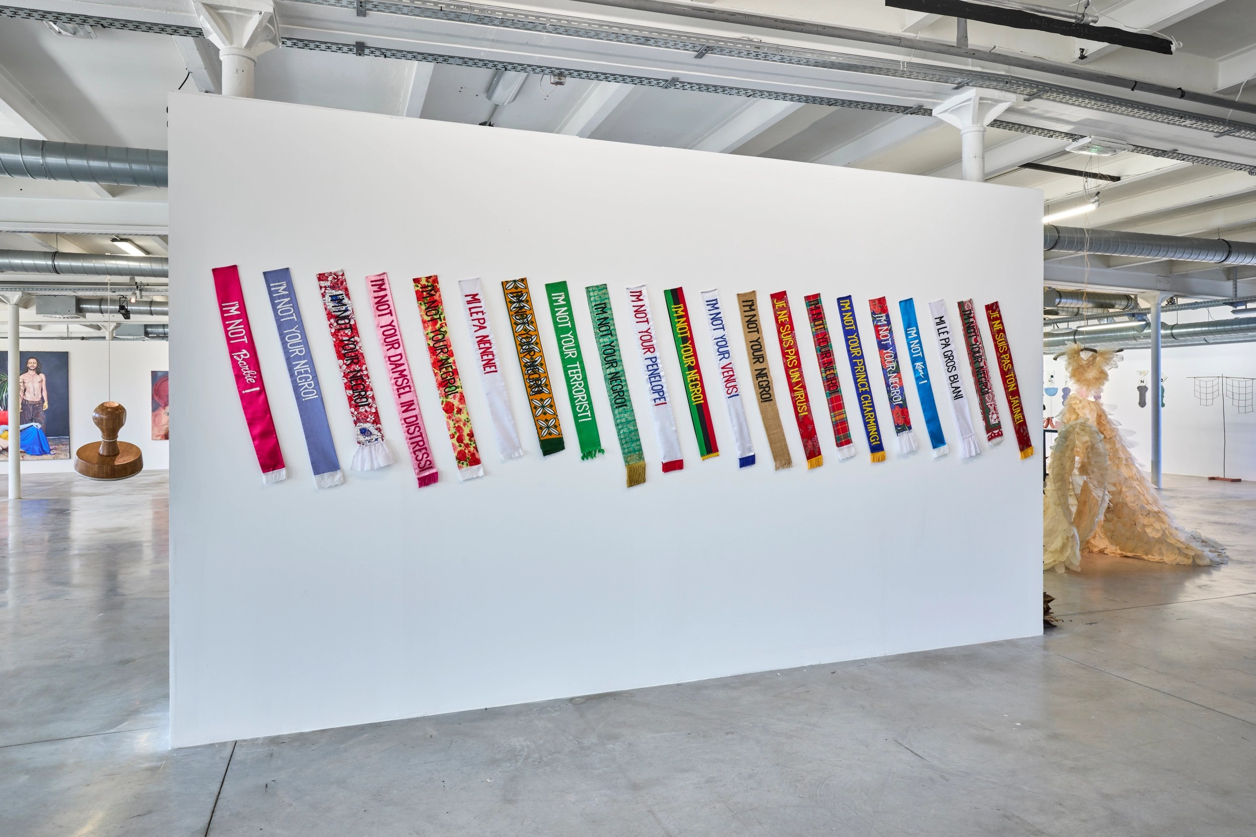 À partir de ce travail aussi graphique que politique, Prudence Tetu déploie une pratique textile, brodée et cousue, qui vient prolonger ses différents axes de réflexion. Les matériaux souples invitent les corps qui, jusqu’ici, étaient suggérés par l’objet et le mot. Elle concilie ainsi les perspectives intimes et politiques. L’artiste réalise une série d’écharpes, inspirées de celles portées par les candidat·e·s lors de concours de beauté ou encore de celles portées par les personnalités politiques. Des écharpes qui symbolisent une forme d’officialité, de représentation publique et de normes imposées. Elles font autorité. Conçues à partir de différents tissus, elles deviennent les supports de messages patiemment brodés : I’m not your Penelope! – I’m not your Venus! – I’m not Barbie! En étudiant l’histoire de l’art occidental, Prudence Tetu prend conscience de l’espace de représentation assigné aux femmes : nues, passives, silencieuses, normées. Elle s’attache particulièrement à la recherche de représentations de femmes noires, qui sont quasi inexistantes. Alors, les écharpes multicolores apportent des réponses efficacement affirmées : Je ne suis pas ! Autrement dit : « Je ne suis pas ton objet exotique. Je ne suis pas un corps soumis. Je ne suis pas ton cliché, ton stéréotype, ton assignation. » Les messages attestent d’un refus catégorique et non négociable. I’m not your terrorist! – Mi lé pa gro blan ! – I’m not your negro!. Ils attestent aussi d’une colère soulignée par la présence du point d’exclamation. Dans le mille-feuille des oppressions, le racisme s’ajoute au sexisme. Prudence Tetu étudie les statistiques : qui enseigne dans les écoles d’art ? qui écrit l’histoire de l’art ? qui expose ? qui représente qui ? qui est absent ? qui subit le silence ? qui résiste ? comment ? Elle déplie les données intersectionnelles et approfondit ses connaissances de l’histoire de La Réunion, ses origines et ses réalités sociologiques actuelles. Les écharpes sont d’ailleurs confectionnées à partir de tissus provenant de différentes communautés culturelles présentes dans l’île. Une recherche textile qu’elle élargit à l’ensemble des territoires ultramarins, aux diasporas asiatique et noire. Je ne suis pas ton jaune ! Par la négation, l’artiste affirme des individualités depuis trop longtemps contraintes par le système dominant.