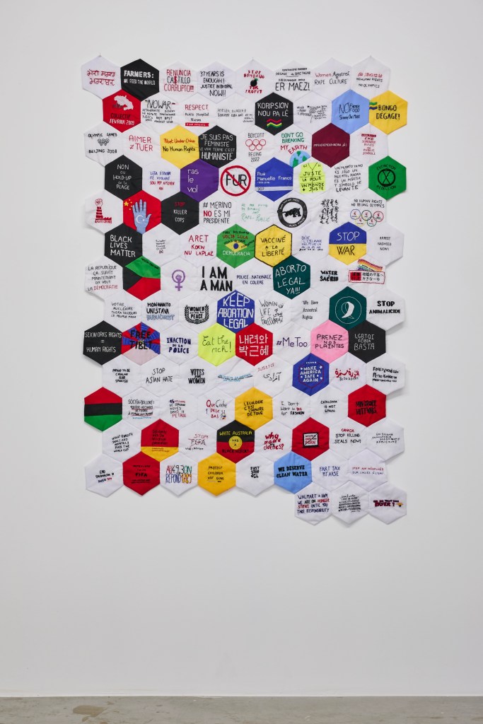 Armée de ses aiguilles dissidentes, Prudence Tetu prolonge les gestes appris de sa grand-mère, un matrimoine qu’elle met au service des militances dans lesquelles elle s’engage. Par là, elle refuse aussi les lieux communs hermétiques et les assignations aliénantes. Elle travaille à la transmission d’histoires résistantes, de mouvements de lutte que le récit de l’histoire rejette en marge du récit dit « officiel ». Une pensée plastique de la transmission motivée par la créolité, que l’artiste travaille localement et globalement. Dans le cadre de cette recherche, elle réalise Tapi militan (2023) : un tapis, une tapisserie, un drapeau réalisés à la manière d’un tapis mendiant, une courtepointe traditionnelle réunionnaise. À partir de tissus recyclés, l’artiste réalise des macarons qu’elle coud et assemble. Chacun d’entre eux est brodé de logos et de messages militants issus d’époques et de zones culturelles plurielles. Des indépendances africaines au LKP, en passant par #MeToo, les Black Panthers ou encore les Gilets Jaunes, Prudence Tetu maille les mouvements de lutte contre les inégalités, pour la dignité, la liberté et l’émancipation collective. Par là, les œuvres trouvent un ancrage situé pour ensuite s’étirer à d’autres zones culturelles, d’autres réalités, d’autres combats. La créolité génère une pensée de la convergence et de l’alliance, qui infuse au sein des matériaux tissés. Engagée dans un soft power (un pouvoir souple, doux, fibreux), l’artiste renverse et annule le mépris et les assignations de genre fabriqués envers non seulement les femmes, mais aussi les pratiques textiles populaires, artisanales, amatrices et traditionnelles. Assise, les yeux rivés sur le fil, aiguille en main, Prudence Tetu prend le temps de constituer une trame interculturelle non seulement des oppressions, des violences et invisibilisations, mais aussi des forces désobéissantes et libératrices.