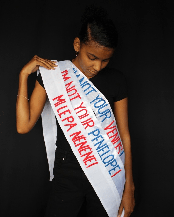 Au départ il y a les mots, le stylisme et la recherche d’une convergence de territoires. Au centre de la convergence, Prudence Tetu installe un engagement radical : féministe, antiraciste et décolonial. Très tôt, elle analyse la place et le rôle du mot au sein des systèmes de pensées dominantes et des propagandes politiques de tous bords. Elle est attentive à la dimension graphique du mot, aux typographies et à l’efficacité visuelle de leurs articulations. Les mots trouvent ainsi leur place au cœur d’installations-manifestations à travers lesquelles l’artiste interroge la langue créole, le langage quotidien. Elle sonde par exemple les insultes créoles et plus largement internationales qui, systématiquement, convoquent un sexisme et un racisme décomplexés. Langèt ton monmon – Nique ta mère – La concha de tu madre. Ces insultes employées quotidiennement soutiennent les violences du système hétérocapitaliste et patriarcolonial présent dans le langage courant. L’artiste poursuit sa recherche en se passionnant pour les manifestes politiques, les textes générés par les mouvements de révolte, d’émancipation et de résistance. Étudiante à l’école d’art du Port, elle fabrique un Petit Journal de militant·e·s, un livre rouge contenant des outils d’action, des messages et d’autres accroches politisées. Plus tard, elle réalise My Little Militant Box (2019), une petite boîte blanche de couture dans laquelle sont disposées des bobines de fil rouge et une aiguille. Aux cocktails Molotov, l’artiste préfère du fil et une aiguille. Il s’agit alors de rassembler et de créer les outils pour répondre aux violences visibles et invisibles. Les fondations intersectionnelles des œuvres croisent inévitablement les privilèges et les oppressions à l’échelle d’une expérience aussi personnelle que collective. L’intersectionnalité est un des outils qui permet à la fois de situer une parole, un corps dans une société, mais aussi de visibiliser les impensés, la puissance destructrice des stéréotypes et des assignations de race, de classe et de genre.