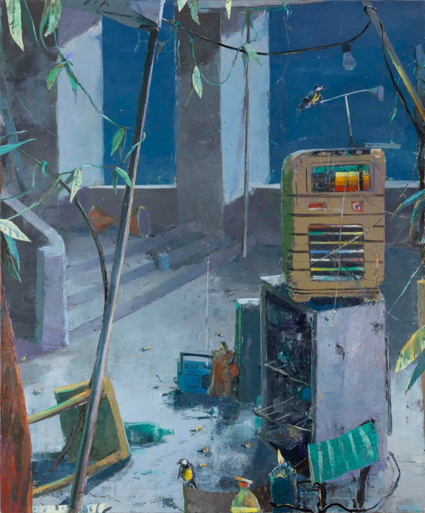 Dans une ambiance de squat nocturne, l’artiste crée des junk spaces où gisent les artefacts de nos existences passées et présentes. Le béton y rencontre la végétation, tandis que les animaux peuplent les tas d’ordures. Il ne s’agit en aucun cas de nature morte dystopique car comme le souligne l’artiste : la vie y est omniprésente. L’artiste précise que “l’absence humaine donne de la place aux choses et aux êtres non humains”. Des araignées à la chouette en passant les mésanges, l’escargot ou le lièvre, la vie animale se déploie au gré des scènes. De même les arbres et les saxifrages coévoluent avec les ruines humaines pour former un paysage commun. Une perspective vivante que l’artiste manifeste aussi par sa manière de peindre : rapidement, en laissant les traces de ses différents passages sur la toile, des passages brutaux qui forment des couches, des aspérités et des textures. “Ma peinture n’est pas plate, elle n’est pas une image sans épaisseur.” S’il peint rapidement, Fritz Bornstück parle d’un temps long de fermentation pendant lequel il revient plusieurs fois sur son travail. La densité des gestes et de la représentation génère des mouvements contraires, une vibration et une forme de toxicité en adéquation avec l’univers post-humain qu’il s’acharne à dépeindre.