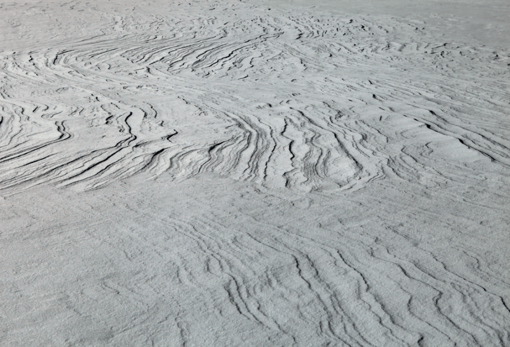 Vanessa Gandar prend la route dans son van et prend les sentiers à pied pour capter des moments singuliers. Elle est à la recherche d’une forme d’équilibre, d’un moment suspendu entre un état et une transformation de ce dernier. Elle travaille le plus souvent à l’argentique dans des conditions climatiques extrêmes. Ceci explique en partie la rareté de ses images. Vanessa Gandar rend compte de lumières, de signes : des traces, des lignes sur les sols, à la surface des roches, dans la glace. Fascinée par les formes, la graphie des paysages, la géologie, la cartographie (scientifique et mentale) elle est guidée par le besoin de documenter d’autres langages (plus qu’humains), d’autres temporalités pour fabriquer un espace où la narration spéculative devient possible. Au-delà de la dimension contemplative, chaque image peut être envisagée comme l’amorce d’un récit.