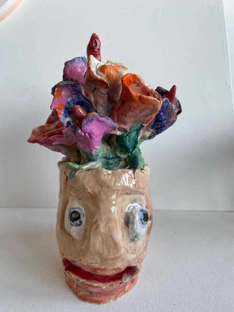 A motif is embedded in various places: a wooden ladder. The ladder embodies escape, evasion, the need to get away, to look elsewhere. The ladders rise up from the mountains, out of the open windows of houses and apartments. Their presence offers a critical opening for reflection on our withdrawn, unconscious, selfish and individualistic lifestyles. Philip Grözinger speaks of escapism. The dictionary defines this little-used concept as follows: « An attitude that consists in withdrawing from the world and civic life, through flight or disillusionment, as opposed to speaking out or taking individual or social action. Escape from reality. » So the artist creates a universe where the real and the fake are blurred. He sets the scene for an artificial, dysfunctional interior: a fireplace on which ceramic and bronze works are placed, a wooden television, a footstool, a game console, a bouquet of stylized flowers in minecraft style, etc. Philip Grözinger extracts motifs from his paintings to turn them into sculptural objects. He extracts motifs from his paintings to create sculptural objects. He writes: « For me, it’s all meant to symbolize the false nostalgia for a time when everything was better, and the retreat into the private sphere. »