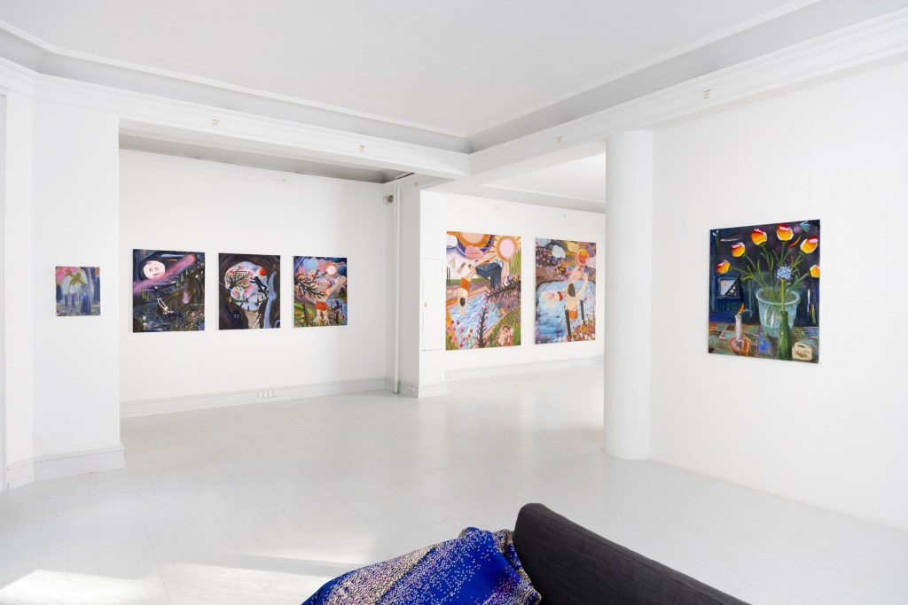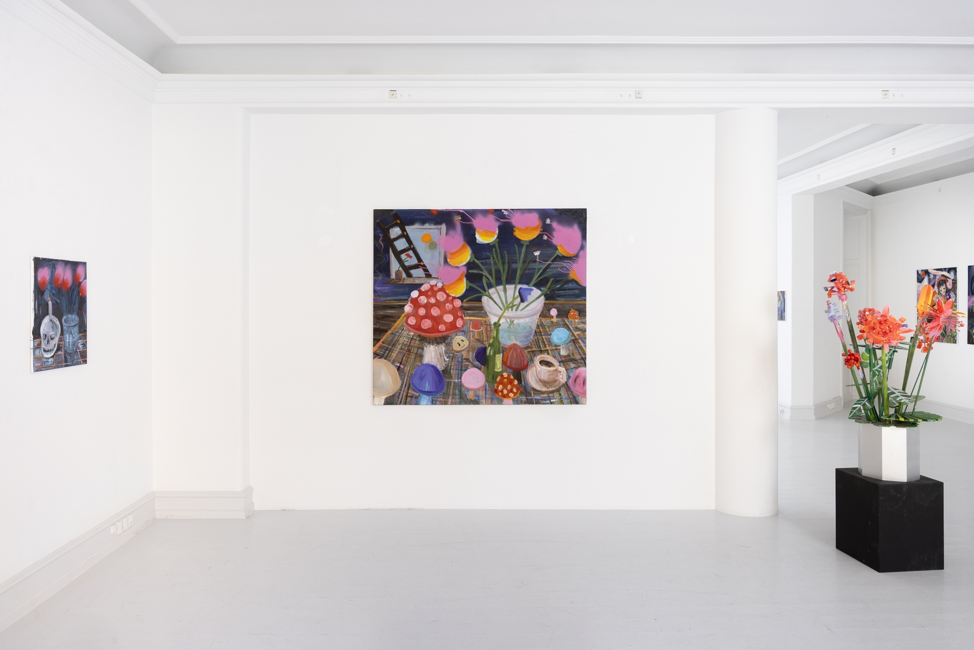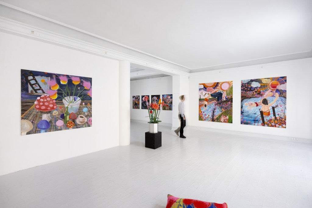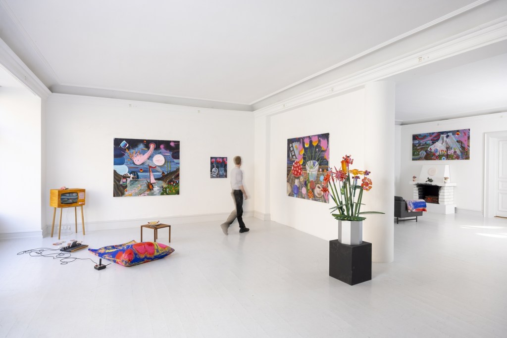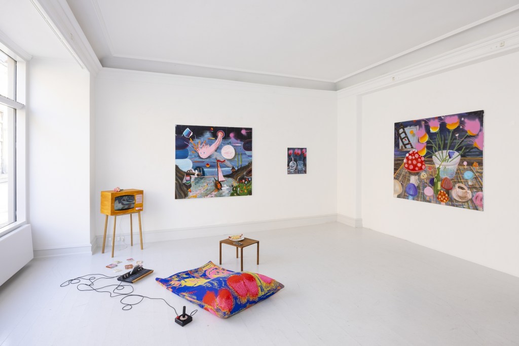 The exhibition is conceived as a set whose matrix is the painted work. Philip Grözinger paints a world that doesn’t exist, a society nourished by modernist utopias in which living beings desperately try to develop a strategy of joy. The colors are flamboyant, pop, childlike and joyful. The lights are radiant. Flowers are omnipresent. The eyes of the human-looking figures are wide, ecstatic, pathologically focused on objects that could make them happy: a bouquet of flowers, a cell phone, a swimming pool, the sun, the sky, a radio or a television. The figures strive to play, to maintain a life of leisure in an oh-so-superficial universe.These de-realized, anaesthetized figures choose immediate pleasures, quick gratification and dopamine bulimia. Their exorbitant eyes and apathetic gazes manifest behaviors as addictive as they are robotic. Our lives must remain instagrammable, in other words: the backdrops of capitalist fantasies symptomatic of a collective renunciation.