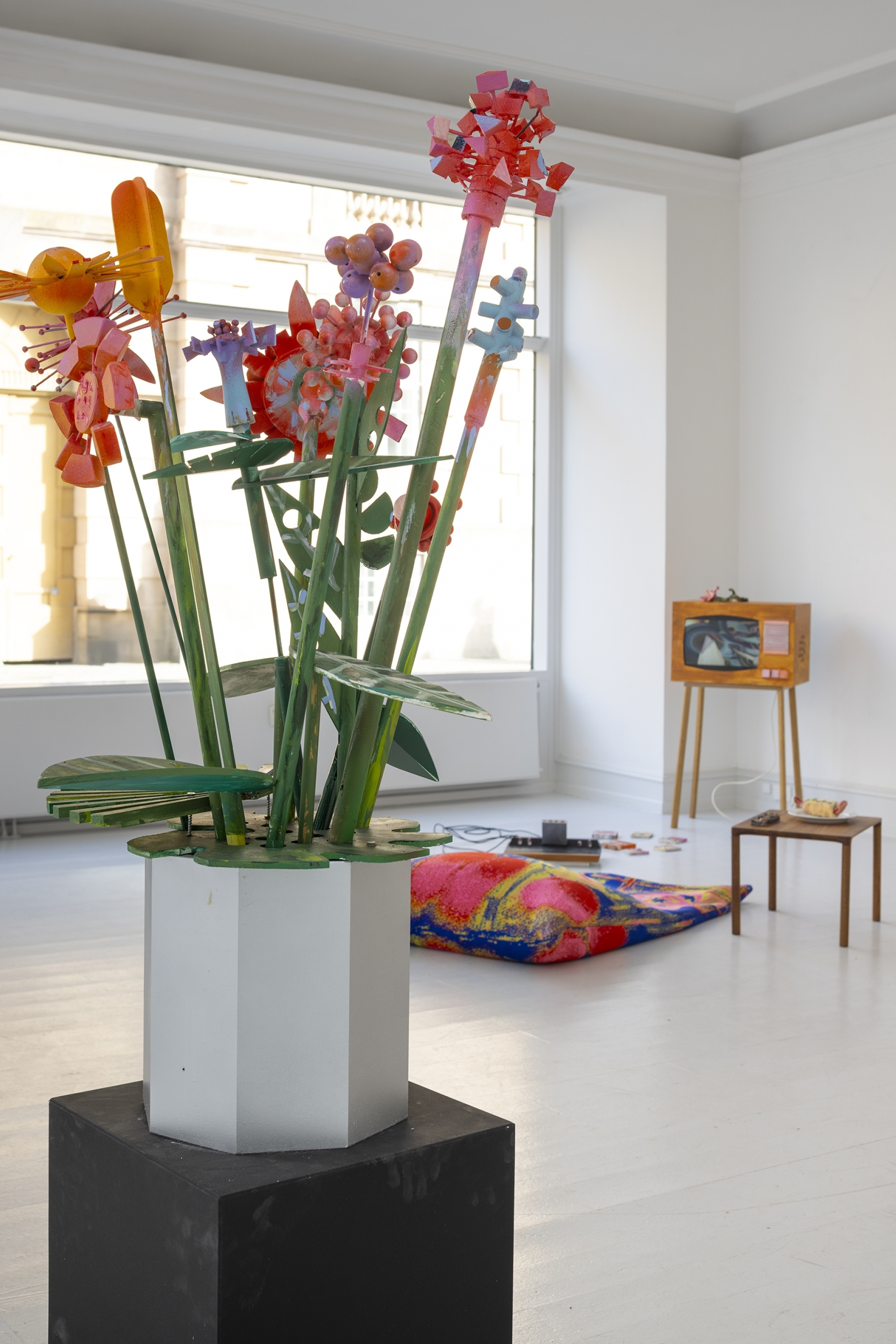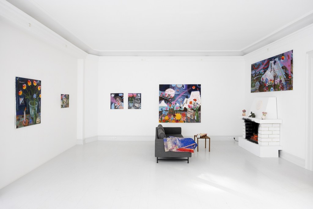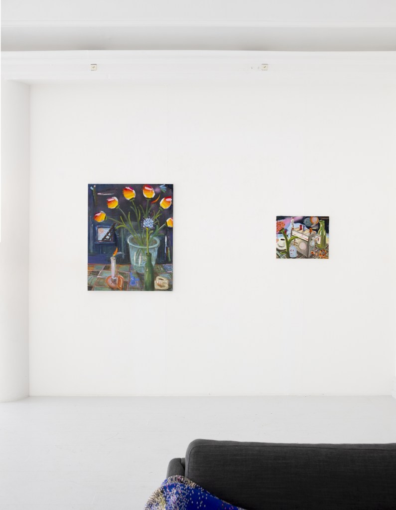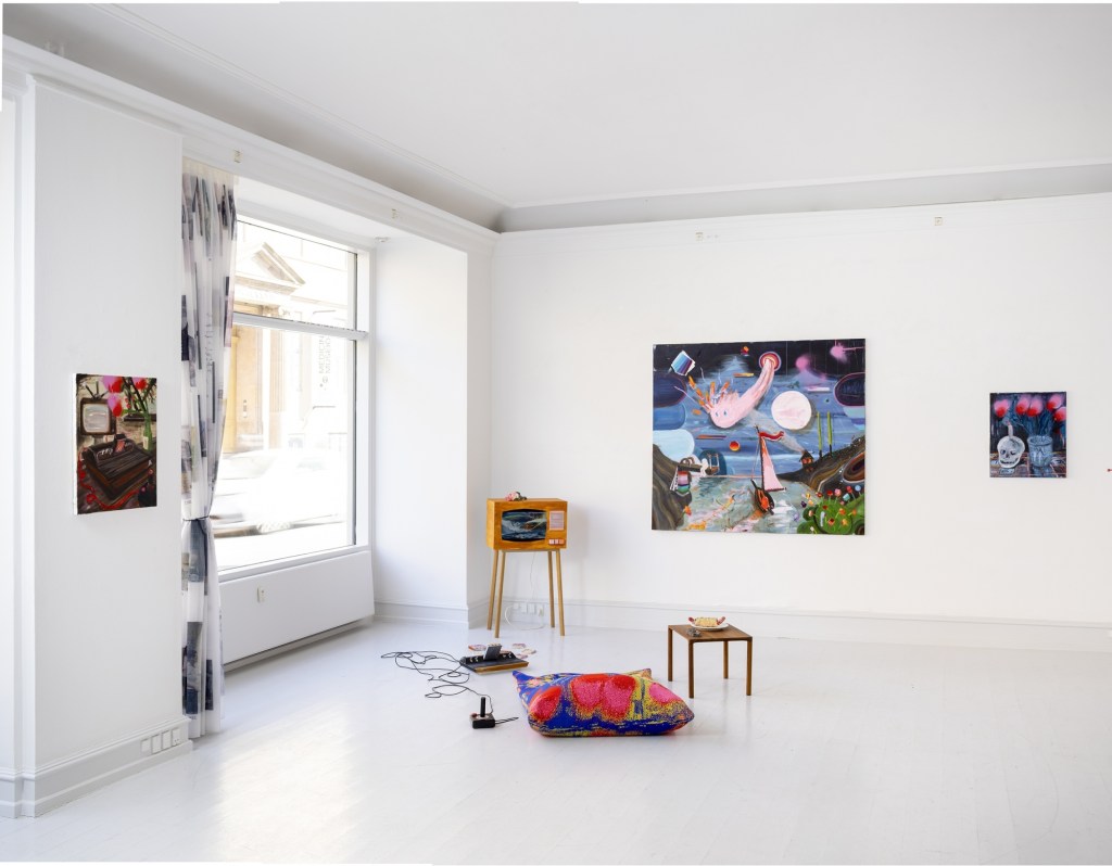 The exhibition is conceived as a set whose matrix is the painted work. Philip Grözinger paints a world that doesn’t exist, a society nourished by modernist utopias in which living beings desperately try to develop a strategy of joy. The colors are flamboyant, pop, childlike and joyful. The lights are radiant. Flowers are omnipresent. The eyes of the human-looking figures are wide, ecstatic, pathologically focused on objects that could make them happy: a bouquet of flowers, a cell phone, a swimming pool, the sun, the sky, a radio or a television. The figures strive to play, to maintain a life of leisure in an oh-so-superficial universe.These de-realized, anaesthetized figures choose immediate pleasures, quick gratification and dopamine bulimia. Their exorbitant eyes and apathetic gazes manifest behaviors as addictive as they are robotic. Our lives must remain instagrammable, in other words: the backdrops of capitalist fantasies symptomatic of a collective renunciation.