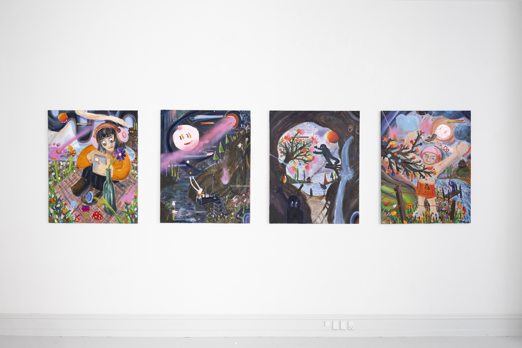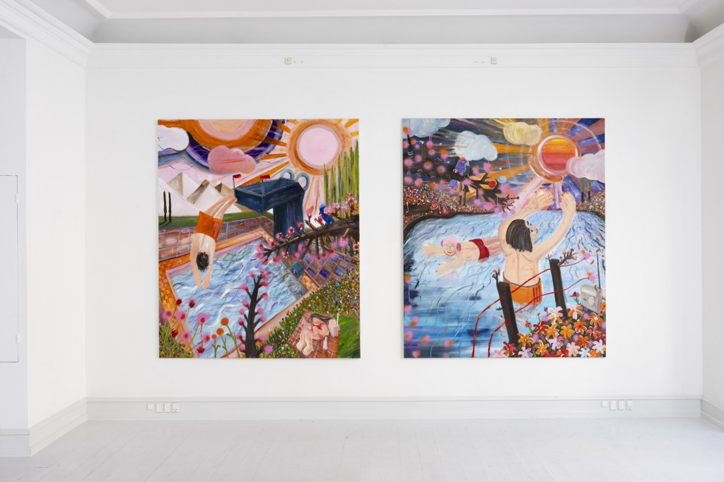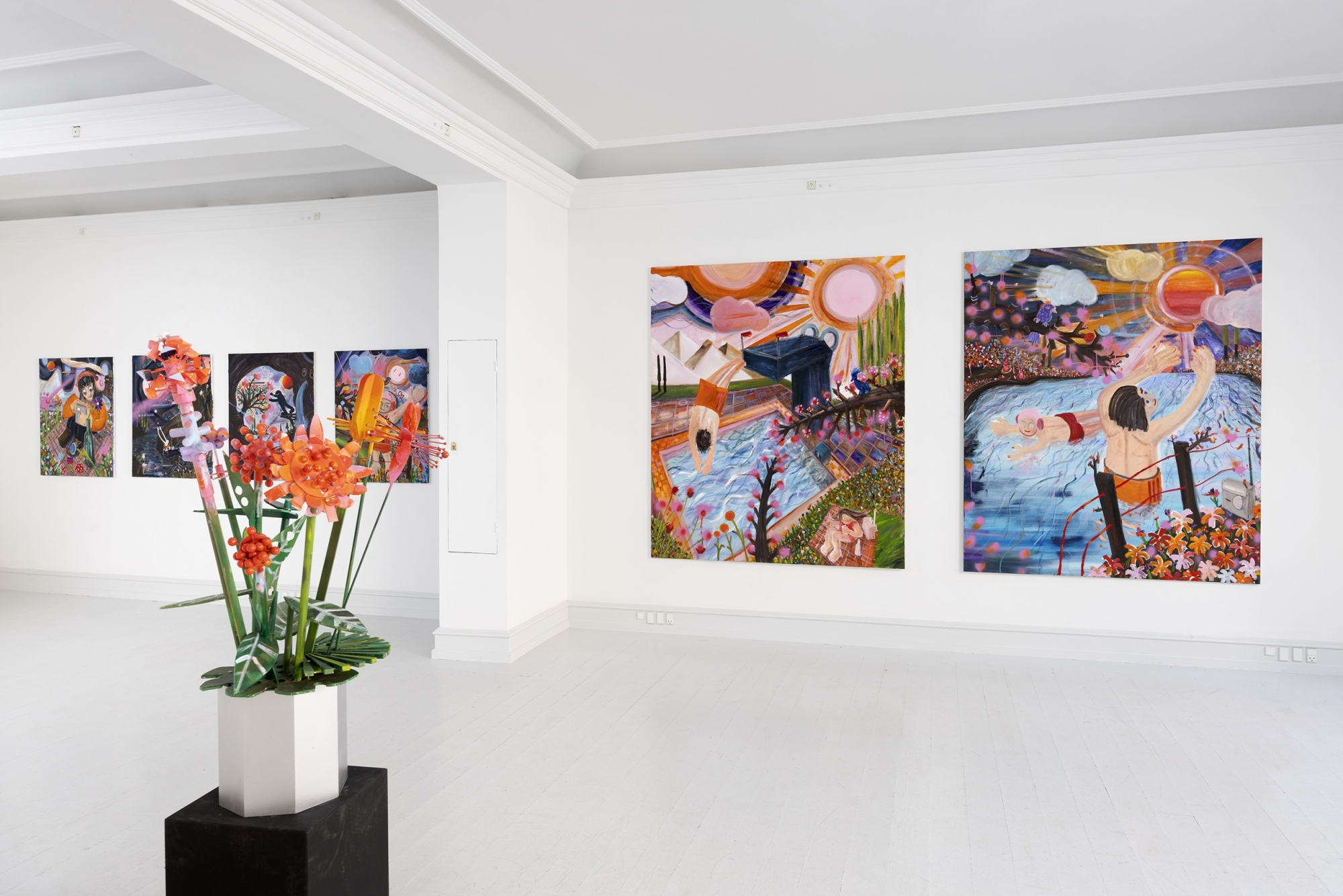 L’exposition est pensée comme un décor dont la matrice serait l’œuvre peinte. Philip Grözinger peint un monde qui n’existe pas, une société nourrie d’utopies modernistes au sein desquelles les êtres vivants tentent, désespérément, de développer une stratégie de la joie. Les couleurs y sont flamboyantes, pop, enfantines et réjouissantes. Les lumières sont irradiantes. Les fleurs sont omniprésentes. Les yeux des personnages aux apparences humaines sont écarquillés, extasiés, concentrés d’une manière pathologique sur des objets qui pourraient les rendre heureux : un bouquet de fleur, un téléphone mobile, une piscine, le soleil, le ciel, une radio ou une télévision. Les figures s’évertuent à jouer, à entretenir une vie de loisirs dans un univers ô combien superficiel. Ces figures dé-réalisées et anesthésiées font le choix de plaisirs immédiats, de satisfaction rapide, d’une boulimie de dopamine. Leurs yeux exorbités et leurs regards apathiques manifestent des comportements aussi addictifs que robotiques. Nos vies doivent absolument rester instagrammables, à savoir : les décors de fantasmes capitalistiques symptomatiques d’un renoncement collectif.