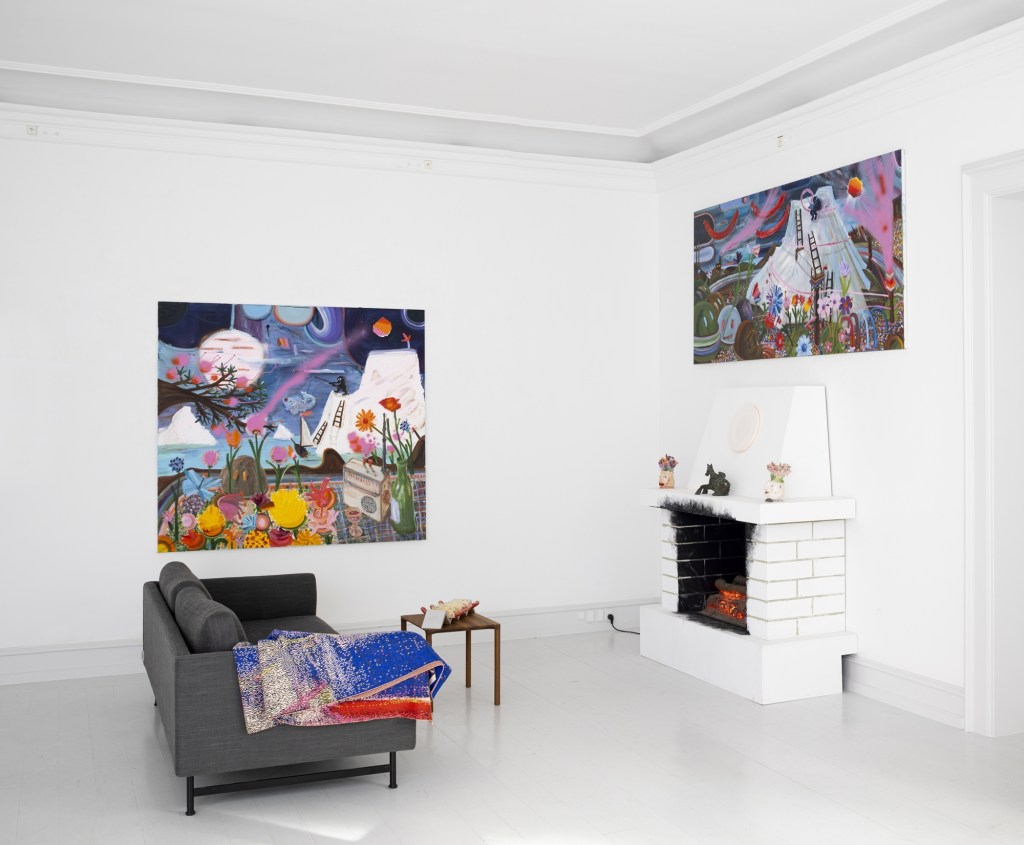 Un motif s’incruste à différents endroits : une échelle en bois. Cette dernière incarne l’échappée, l’évasion, la nécessité de s’en aller, d’aller voir ailleurs. Les échelles se dressent sur les montagnes, elles surgissent des fenêtres ouvertes des maisons et des appartements. Leur présence propose une ouverture critique quant à une réflexion à propos de modes de vie repliés, inconscients, égoïstes et individualistes. Philip Grözinger nous parle ainsi d’escapisme. Le dictionnaire définit ainsi cette notion encore peu employée : “Une attitude qui consiste à se retirer du monde et de la vie civique, par fuite ou désabusement, par opposition à la prise de parole ou à l’action individuelle ou sociale. Évasion de la réalité.” Alors, l’artiste fabrique un univers où le vrai et le faux sont brouillés. Il dresse le décor d’un intérieur factice et dysfonctionnel: une cheminée sur laquelle sont disposées des œuvres en céramiques et en bronze, une télévision en bois, un pouf, une console de jeu, un bouquet de fleurs stylisées à la manière Minecraft, etc. Philip Grözinger extrait des motifs de ses peintures pour en faire des objets-sculptures. Il écrit : “Pour moi, tout cela est censé symboliser la fausse nostalgie du temps où tout allait mieux et le repli sur la sphère privée.”