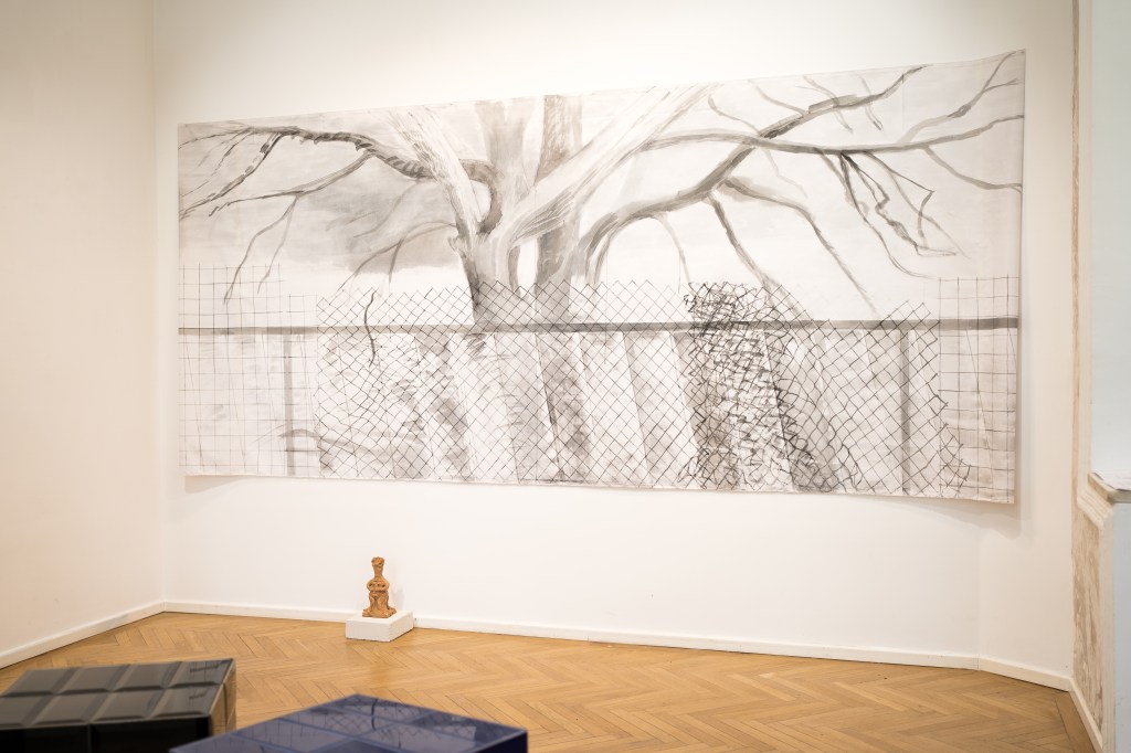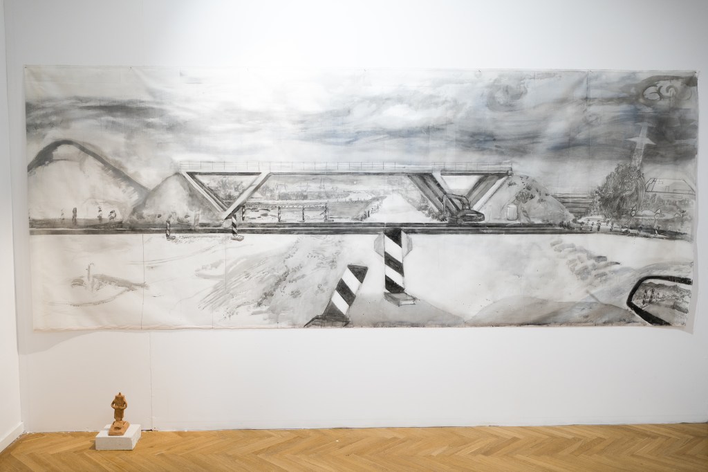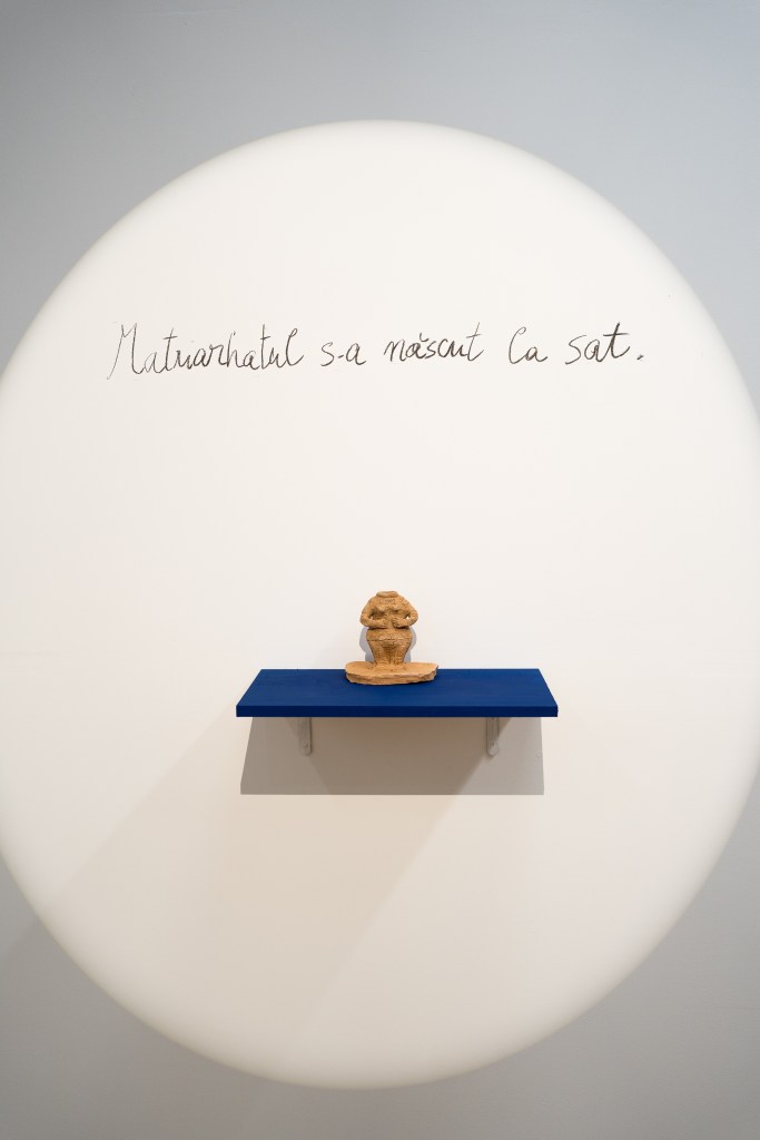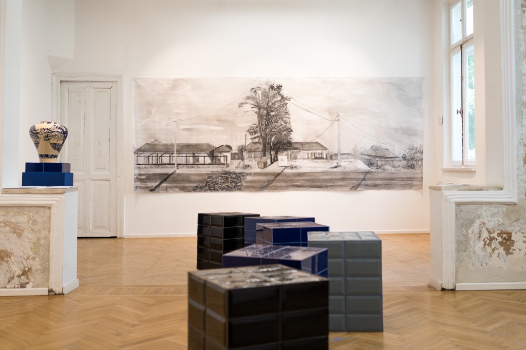 The photographs give rise to a reflection based on a classic, academic pictorial genre: the landscape. Delia Popa takes landscape scenes from the village and transposes them into paintings on paper. To escape Western references and codes, the artist turns her gaze to the East, and more specifically to China. For her, it’s a question of displacing the Western sphere of influence to envisage other perspectives and other cultural circulations. Delia Popa explains: “The project proposes to look at culture(s) as permeable, impure and mutually influenceable. If we think of the Silk Road, one of the first instruments of globalization, we learn that economic and cultural objects have traveled across Eurasia, long before the Americas have been colonized, and have meant constant exchange between actors as diverse as: Azerbaijan, China, Korea, Egypt, Indonesia, Iran, Iraq, Italy, Japan, Kazakhstan, Kyrgyzstan, Malaysia, Mongolia, Pakistan, Russia, Sri Lanka, Syria, Tajikistan, Turkey, Turkmenistan, Ukraine and Uzbekistan.” Crețești’s landscapes are also present on vases made from porcelain, stoneware and terracotta. The shape of the vase is inspired by Korean art and is also found in Chinese art. The paintings and painted vases anchor Delia Popa’s thinking in an intercultural history. On the wall, clay statuettes refer to the Venus de Vidra. The artist shifts the Romanian Neolithic Venus to other imaginary divinities dedicated to joy, trees, play, waste, the river, monuments, the sun, children and adolescents. The (pre)historical anchoring thus generates the creation of a mythology attached to Crețești.