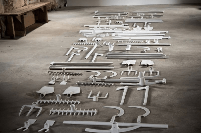 Barbara Schroeder est née à Clèves en Allemagne. Elle a grandi parmi les champs de culture de légumes pensés comme étant populaires et modestes. Des pommes de terre, des navets, des choux. Elle connaît les odeurs de la terre. Celles qui font travailler sa mémoire et qui agitent sa relation au vivant. Elle connaît aussi les odeurs de l’élevage bovin, du foin, de la paille, du poil humide, de la bouse fraîche, puis sèche. L’artiste est aujourd’hui installée dans le vignoble bordelais. Si le milieu est très différent, la relation au vivant l’est tout autant. Les vignes participent d’une monoculture, d’un paysage uniforme où l’élevage y est nettement plus rare. Alors, imprégnée de ces écosystèmes, de ses souvenirs, de ses expériences, de ces temporalités et de ces pratiques plurielles de l’agriculture, Barbara Schroeder fait de la ruralité un sujet de prédilection depuis le début des années 2000. Elle s’allie par exemple aux temporalités paysannes en partageant une relation étirée au temps, aux cycles, une pratique de gestes répétés et un amour de la sédimentation. Plusieurs œuvres découlent d’une multiplication à la fois matérielle et gestuelle. Elle réalise ainsi des œuvres spatiales où des objets-motifs en porcelaine prolifèrent. Elle moule des pommes de terre (Champ des constellations, 2010 – en cours) pour constituer un cycle calendaire puisque trois cents soixante-cinq sculptures sont présentées. Dans un même élan, elle moule cinquante-deux outils (Les semaines blanches, 2025) pour visibiliser le travail continuel des paysan.nes. Parce que le nombre d’œuvres correspond aux cinquante-deux semaines de l’année, Barbara Schroeder traduit le fait que le vivant ne connaît pas de pause lorsqu’on collabore avec lui pour nourrir, élever, entretenir, cultiver et protéger.