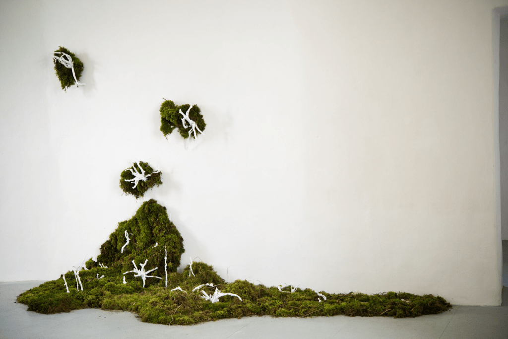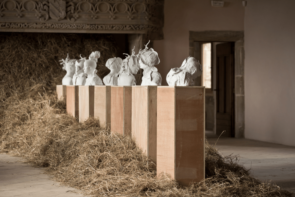 Sur 600 m², À l’orée des champs explore les liens intimes entre enracinement, transmission et rapport au vivant. Mes sculptures en porcelaine réalisées à la Manufacture de la Fabrique rendent hommage au travail des femmes de la terre, à leur mémoire souvent silencieuse. Une pièce centrale, la table de Germaine embousée, élève la bouse de vache au rang de matière artistique, révélant l’intelligence et la puissance du vivant.