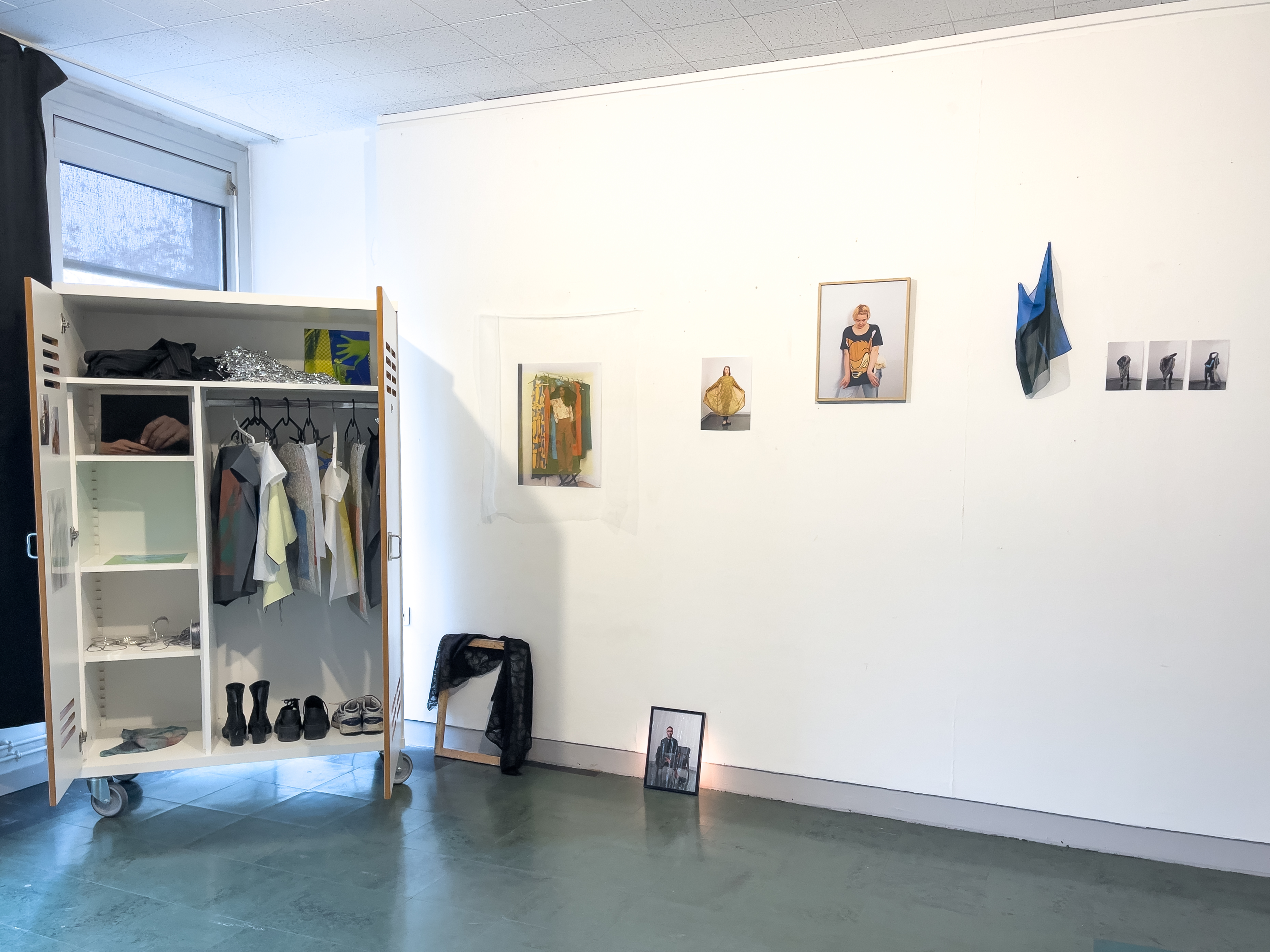 Kama La Mackerel est une artiste mauricienne installée à Montréal. Elle a choisi de montrer à Eleonora Strano l’ensemble de son dressing : des combinaisons et des robes colorées. Kama explique qu’ent tant que femme trans, elle a, par le vetement, construit son identité, son style, sa manière d’apparaitre au monde. Elle parle d’un alignement patiemment pensé entre elle et ses vêtements. C’est ce que Achraf Remok, auteur et commissaire d’exposition marocain installé à Bruxelles, souhaite aussi visibiliser avec sa collection de vêtements chics et sobres. Il raconte à Eleonora Strano une anecdote fondatrice : pendant son enfance, son père a donné tous ses vêtements à un autre enfant. Il s’est alors senti dépossédé et a fait du vêtement une obsession. Finnja est une artiste allemande, qui, par ses vêtements, extériorise son amour pour l’enfance. Elle travaille, sous la forme de workshops, avec des enfants : le sac-peluche est un outil de confiance et de jeu lors de ces moments collectifs. Nelson Henricks, artiste et enseignant à Montréal, porte un costume formé de carreaux de couleurs. Il a lui-même confectionné ce vêtement qui visibilise le fait qu’il est synesthète : il voit les chiffres et les mots en couleur. Doegam Atrokpo, danseur béninois, a choisi de montrer un pagne en wax qui appartenait à son père. Ce dernier était maître de cérémonie, porteur d’un savoir et d’une pratique spirituelle que Doegam a reçu en héritage. Il pose de manière chorégraphique avec le pagne imprimé qui est actuellement l’objet de sa nouvelle pièce de danse.